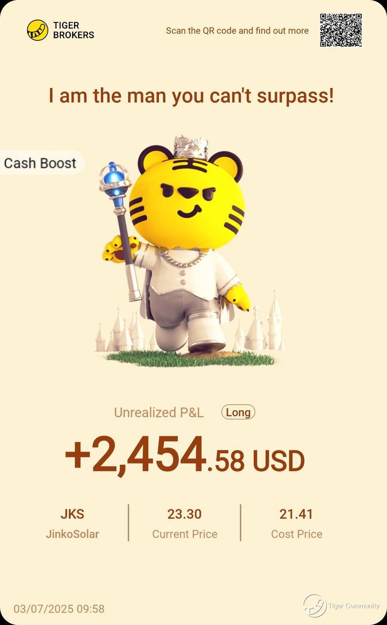 $JinkoSolar(JKS)$ soared by a stunning $2,454 in a single day! From an entry price of $21.41 to a sharp climb to $23.30, the stock delivered an 8.8% daily gain—bringing in $2,454.58 in pure profit. Not only did it outperform the market, it outshined 99% of investors. This is the true power of the solar sector—undeniable and unstoppable. I reign supreme!
