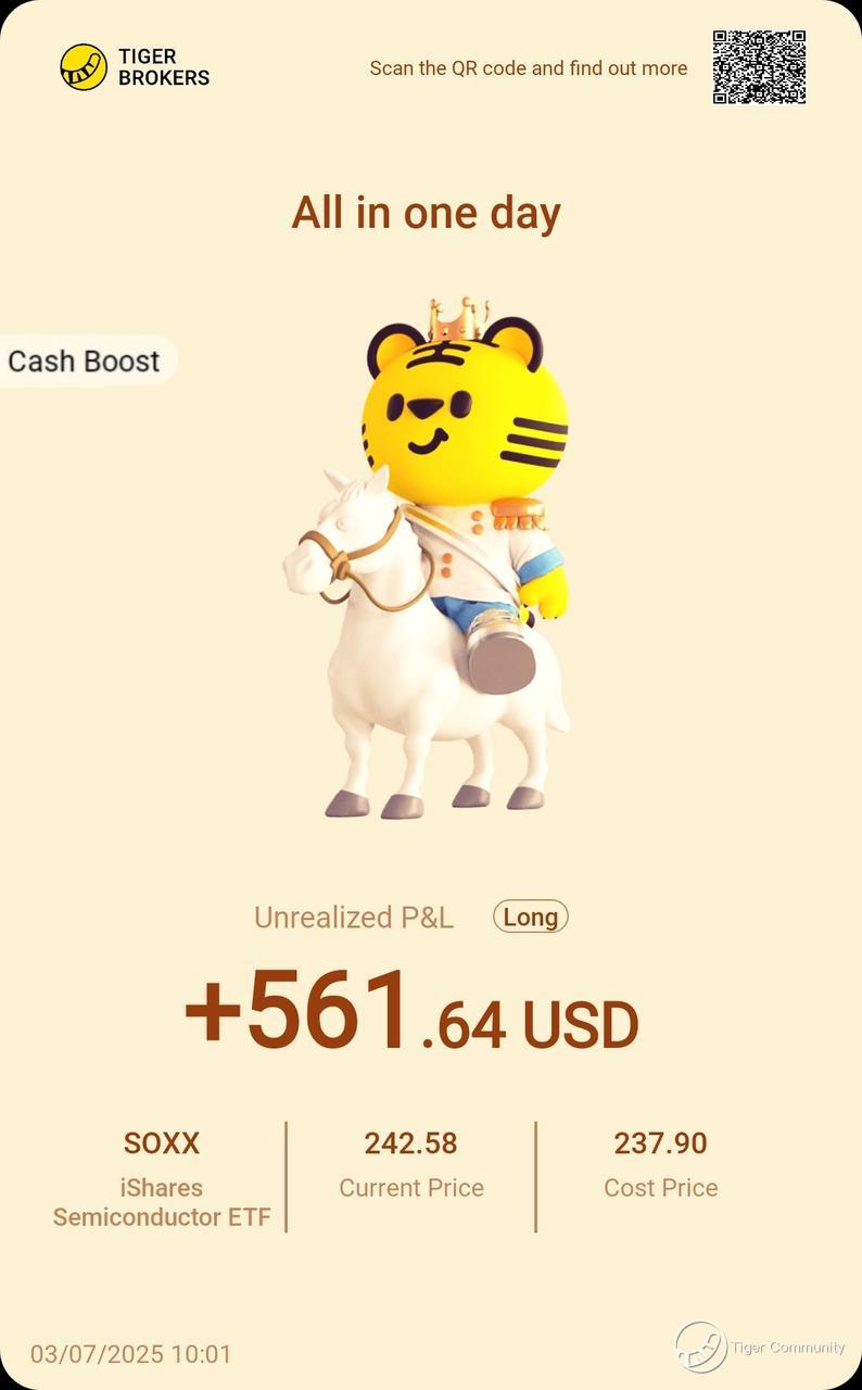 $iShares Semiconductor ETF(SOXX)$ delivered a steady $561 gain in one day as the chip sector continues its strength. The iShares Semiconductor ETF rose from an entry price of $237.90 to $242.58, posting a 2.0% daily gain and $561.64 in profits. This trade confirms the long-term growth thesis of the chip industry fueled by the AI wave.