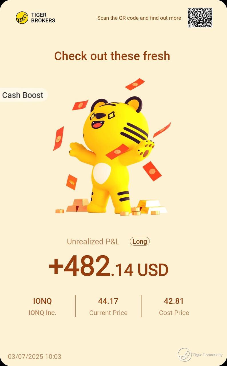 $IONQ Inc.(IONQ)$ Quantum computing leader IONQ gained $482 in a single day, showcasing the potential of cutting-edge technology. The position rose from $42.81 to $44.17, delivering a 3.2% daily gain and $482.14 in profits. This trade highlights growing market attention as quantum computing moves closer to commercialization.