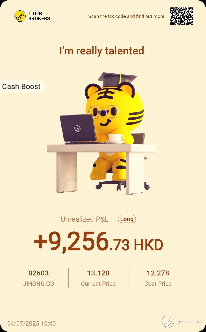 $JIHONG CO(02603)$ gave me a pleasant surprise today! The stock climbed steadily to HKD 13.120, slightly above my entry price of HKD 12.278, and brought in an unrealized profit of HKD 9,256.73! While the gain isn’t jaw-dropping, seeing steady green in the portfolio still feels amazing! This kind of stability is gold, and I’ll definitely keep a close eye on JiHong’s next moves—who knows what surge might come next!
