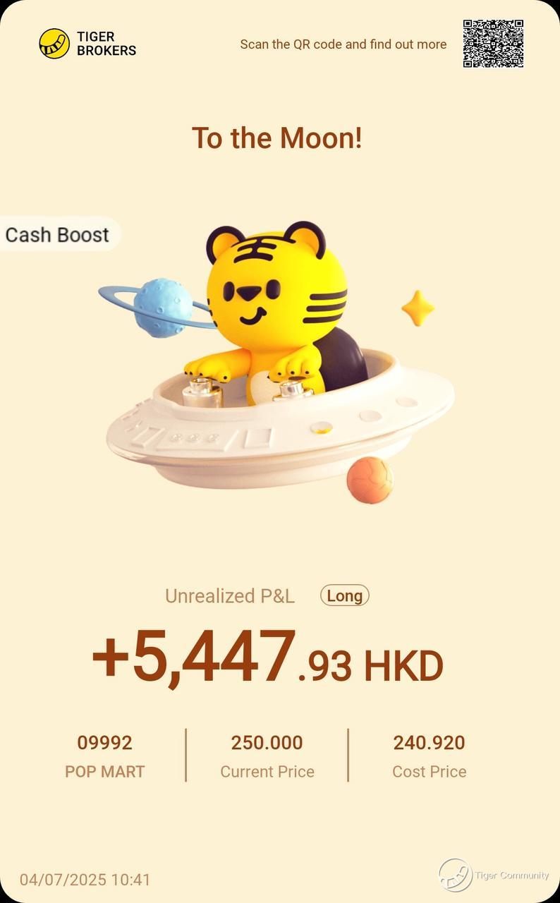 $POP MART(09992)$ really made my day today! The stock jumped to HKD 250.000, breaking past my entry at HKD 240.920, and now I’m sitting on a nice gain of HKD 5,447.93! Seeing that green in my portfolio seriously put a smile on my face. As the trendsetter in the designer toy world, POP MART’s brand power is just undeniable—every new release gets me hyped! I’m super excited about its future IP development and global expansion.