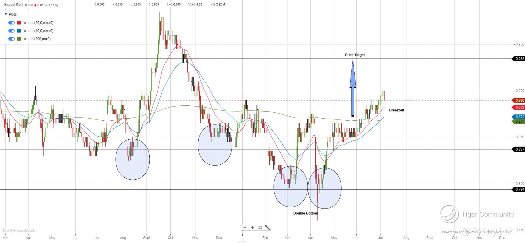 $KEPPEL REIT(K71U.SI)$ broke the 200D SMA resistance from a Double Bottom, a trend reversal chart pattern, and starts an uptrend.