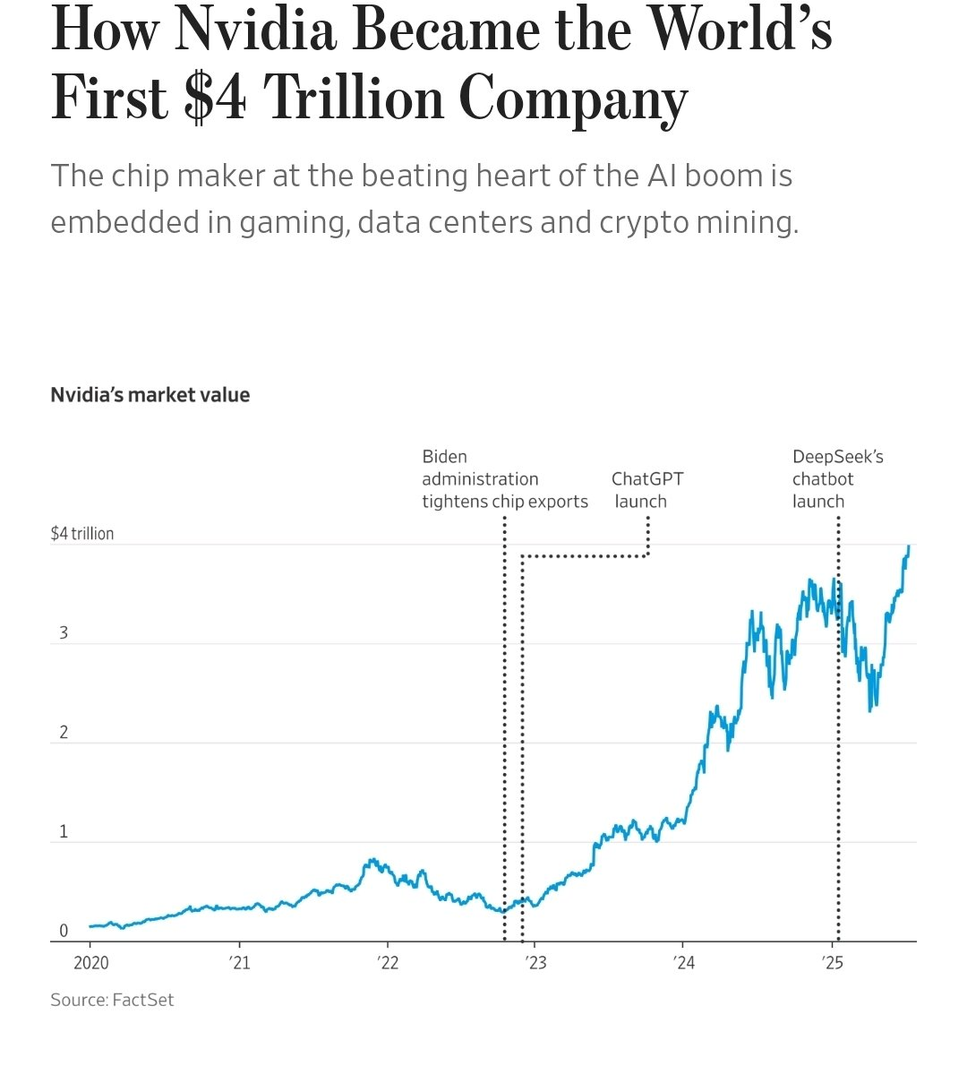 On Wednesday, $NVIDIA(NVDA)$ market cap briefly surpassed $4 trillion during intraday trading, becoming the first company ever to reach this milestone.