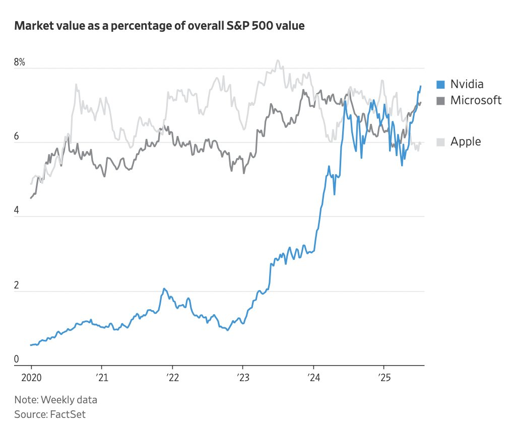 Founded in 1993, Nvidia crossed the $2 trillion mark in February 2024 and passed $3 trillion in June of the same year. Over the past five years, Nvidia’s stock has surged by approximately 1,460%, and it's up nearly 18% year-to-date. Nvidia’s rise is fueled by its near-monopoly in the AI chip market—its GPUs are the backbone of machine learning, data centers, and large language models.