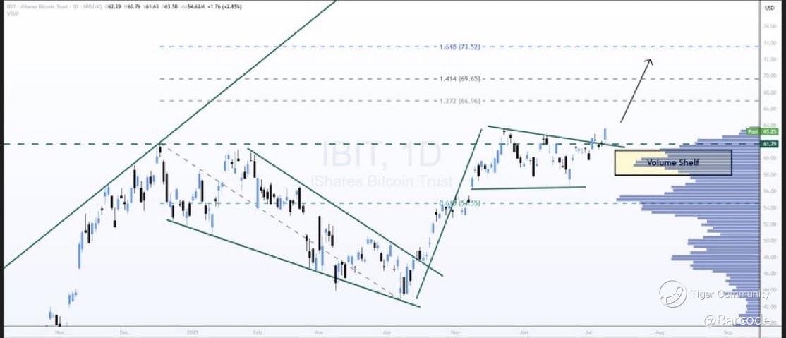 The breakout’s clean. $IBIT pushed through resistance and reclaimed the 0.618 Fib at $60.35, then surged off the volume shelf. It’s now attacking the Fibonacci Golden Ratio at $73.52. Above that? Targets stretch to the 1.414 at $69.65, and the 1.618 extension at $73.52, which aligns perfectly with a confluence zone of historical resistance and bullish continuation patterns.