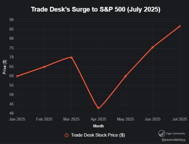 Trade Desk’s addition to the S&P 500 is a seismic event. Index funds and ETFs tracking the S&P 500 must buy shares, driving significant buying pressure. Historically, stocks added to the S&P 500 see an average 5-10% short-term pop, with some sustaining gains if fundamentals align. TTD’s 14% after-hours surge to $86.75 from $75.43 on July 14, 2025, aligns with this trend, pushing its market cap to ~$42 billion. The inclusion boosts visibility, liquidity, and investor confidence, positioning TTD as a must-own name in the ad-tech space.