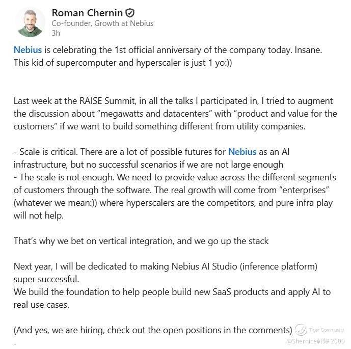 A compelling post from $NEBIUS(NBIS)$ co-founder Roman Chernin highlights how the company is carving its own path in AI infrastructure.
