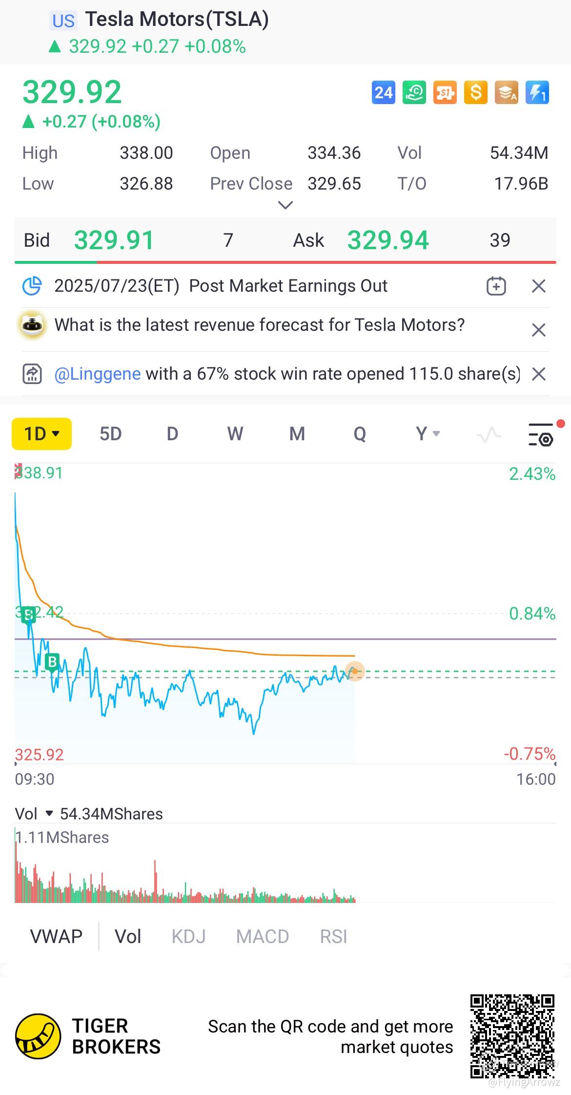 $Tesla Motors(TSLA)$ will it fly up to 345 in the morning ? And drop back to 335 in the afternoon?