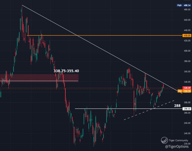 The stock has been making higher highs and higher lows since early July, a clear sign of bullish momentum. It’s trading above its 50‑day SMA ($315) and 200‑day SMA ($290), both of which are sloping upward, indicating the primary trend is up. Near‑term resistance sits at $340–$345 (recent intraday highs), with support around $320. A decisive breakout above $345, especially after earnings, could light up a move toward $380 and $430 next. The risk here is that it is hard to predict earnings, with the negative scenario being a huge drop ignoring the support around $320, and further downside towards $300 and $288 next.
