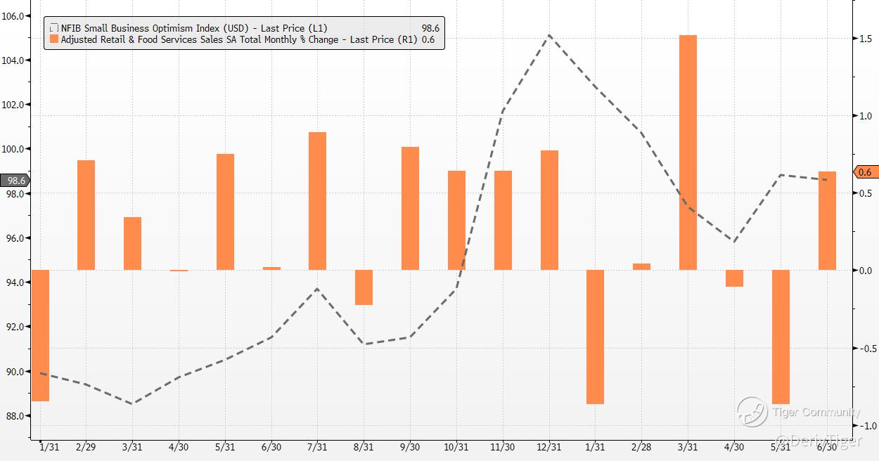 On the other hand, June's retail data was equally strong, rising 0.64% month-over-month, significantly exceeding expectations and the previous month's value, and breaking a two-month streak of declines. From the sector perspective, the rebound was broad-based. The automotive and parts sector, the largest in weight, rose 1.2%, and other sectors such as construction, apparel, food, and pharmaceuticals all saw increases. Furthermore, the Control Group, which is included in GDP calculations, rose 0.5%, expanding its growth rate. Although retail data tends to lag, this performance at least indicates that U.S. consumer sentiment remained robust as of June, unaffected by significant tariff impacts. From the business side, the U.S. June Small Business Optimism Index recorded 98.6, a relatively optimistic level compared to the past year.