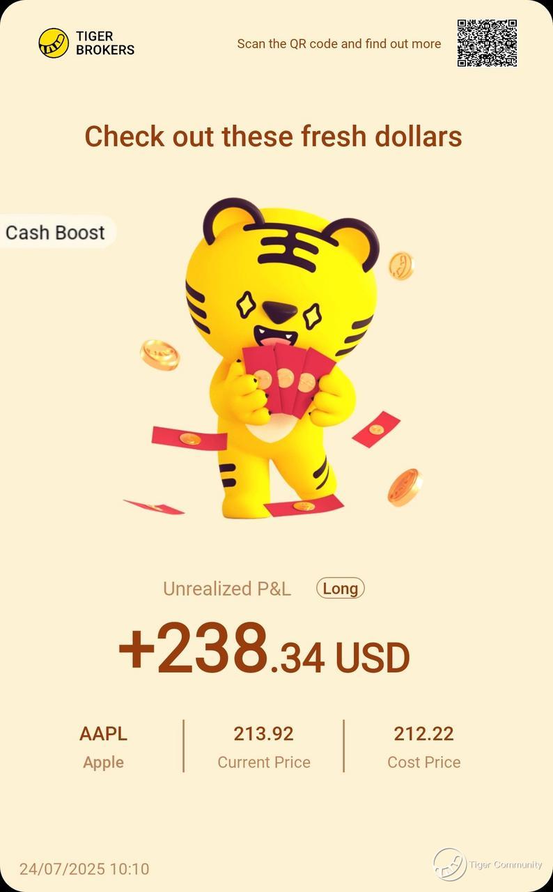 $Apple(AAPL)$ A small win on Apple this round—not a huge jump, but holding a core tech giant like this just feels solid. With AI rollout and hardware upgrades, fundamentals remain strong. Still bullish!