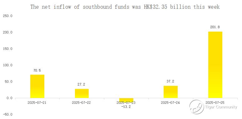Southbound funds have been pouring into Hong Kong stocks at an unprecedented pace, with net purchases totaling HK$ 32.35 billion this week.