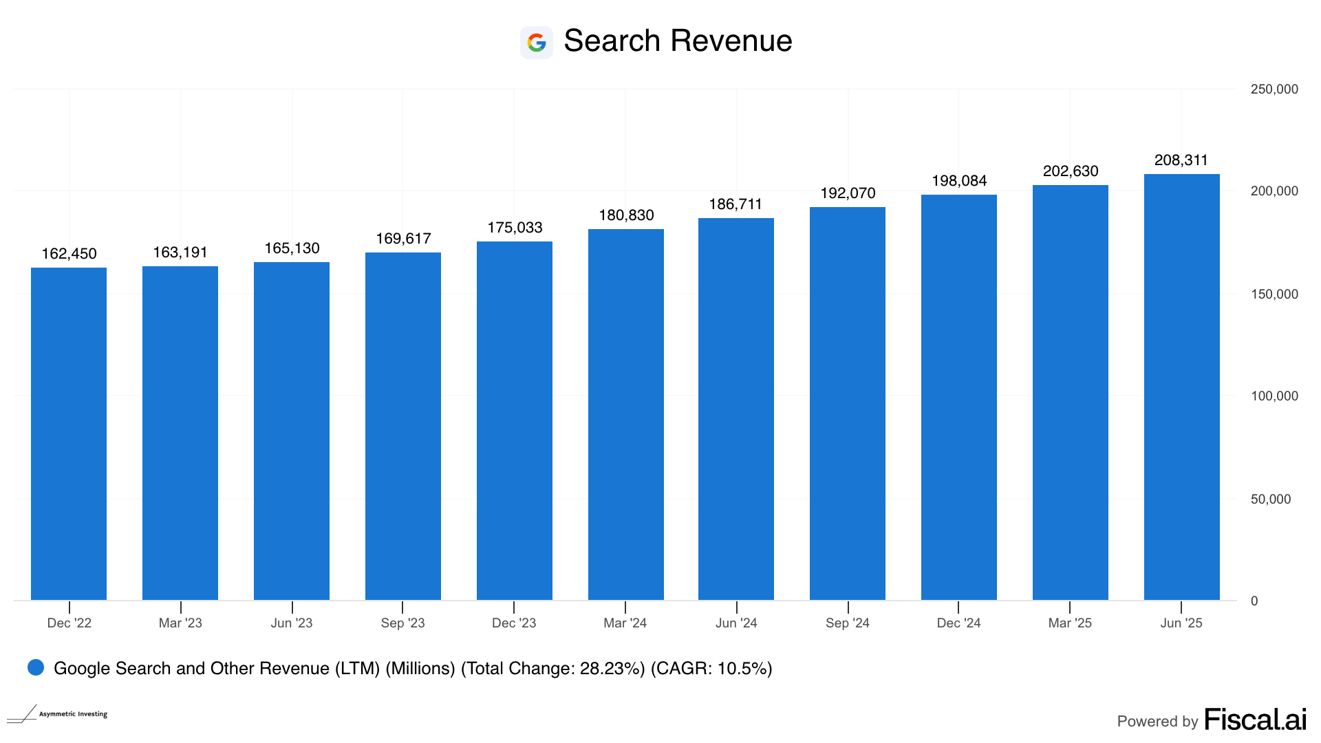 To respond, Google has launched AI Overviews and AI Mode, which bring AI answers into search results. And you can see that search shows no signs of stopping. The chart below shows search revenue since ChatGPT was launched.