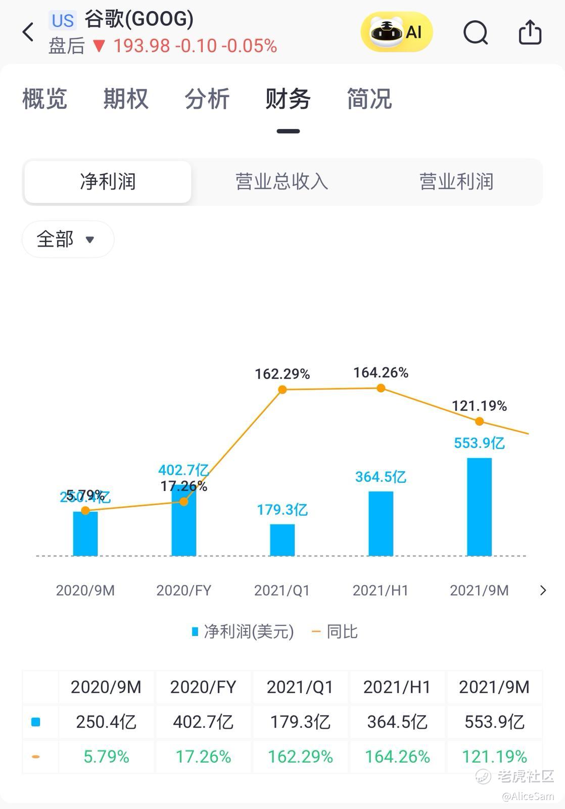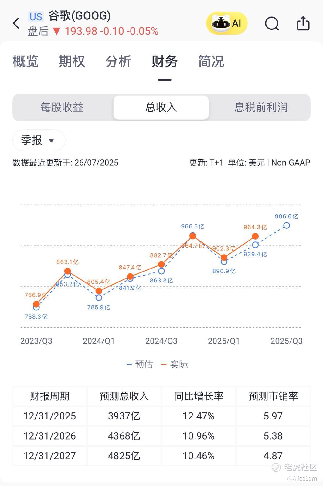 Google這個季度的每股收益(EPS)爲 2.31美元,同比增長 22%,環比增長約 8.5%。如果我們從老虎個股頁面的這個季度對比圖看,Google這麼多個季度以來,EPS一直是穩定的保持着一個上升的姿勢,下個解讀的預期,也是延續着這個趨勢的。穩得很 👍