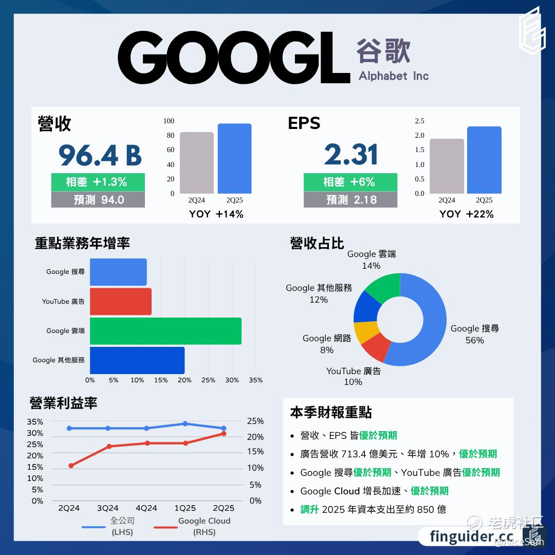 今天來學習一下近期的財報。看到Google的母公司Alphabet在2025年第二季度交出了一份亮眼的成績單 $谷歌(GOOG)$ ,可以來讀一讀,從下面這張財報總結圖一眼看過去,幾乎各項關鍵數據都是正向的增長。驚豔的很。👍