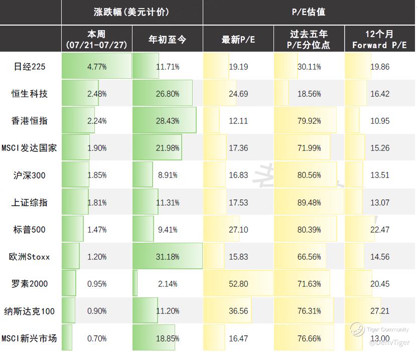 Last week, the main macro driver continued to be tariffs. On one hand, the EU and U.S. unexpectedly reached a 15% tariff agreement, significantly lower than the 30% initially threatened by Trump. In exchange, Europe committed to opening its markets, increasing investments by $600 billion, and purchasing $750 billion worth of U.S. energy and defense products. This result can be seen as a comprehensive compromise by Europe, but from a capital market perspective, it has significantly reduced the risk of EU-U.S. decoupling, which is positive for the market. On the other hand, the third round of China-U.S. trade talks is about to begin in Stockholm. Previously, both sides eased restrictions on exports of rare earths and chips, and there are recent rumors that the top leaders of both countries may meet soon, all of which are positive signs. As of now, the U.S. has reached trade agreements with key countries such as Europe, Vietnam, and Japan. The situation with China-U.S. relations is unique and will take time to resolve, while Canada and Mexico remain significant uncertainties.
