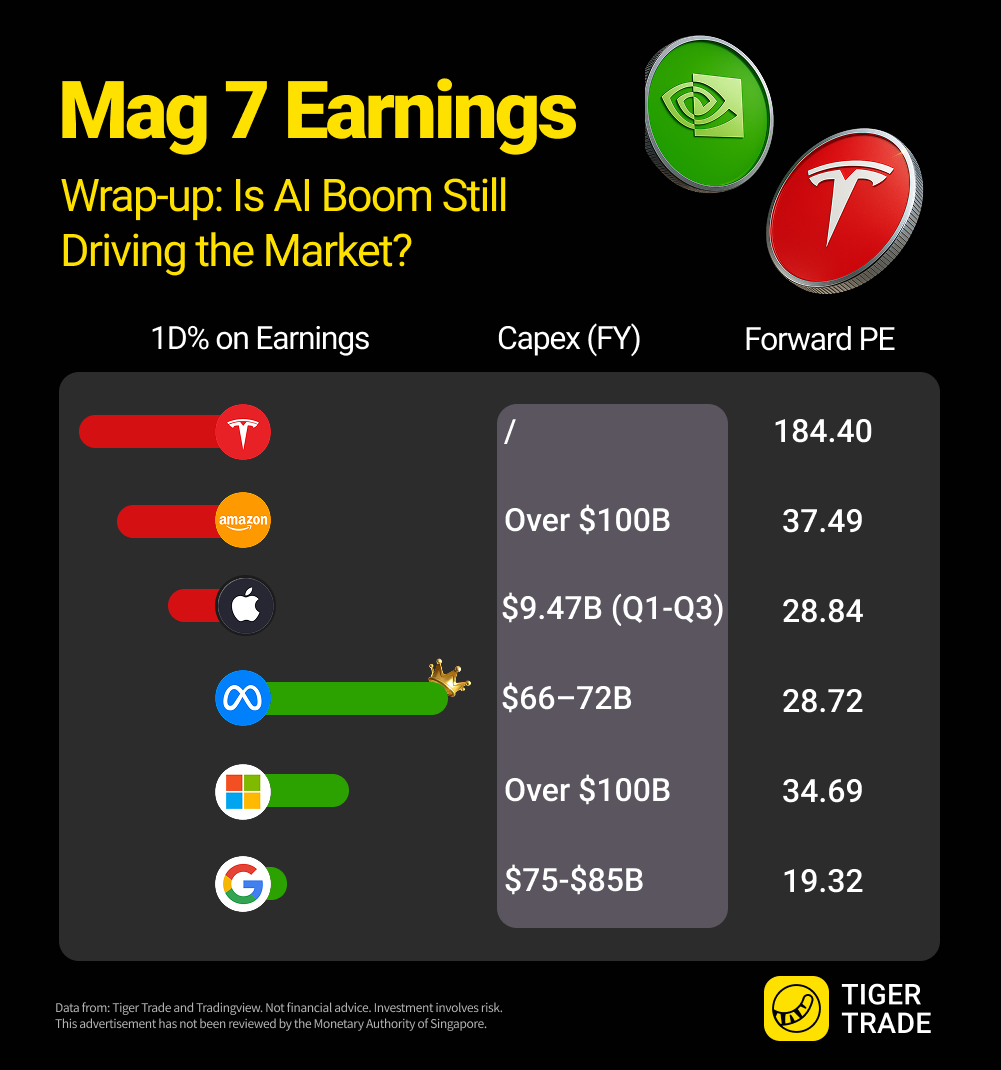 Big Tech's earnings season is nearly complete — with only $NVIDIA(NVDA)$ left on deck. Among the Magnificent 7, 3 names rallied after their reports, while Tesla, Amazon and Apple stumbled.