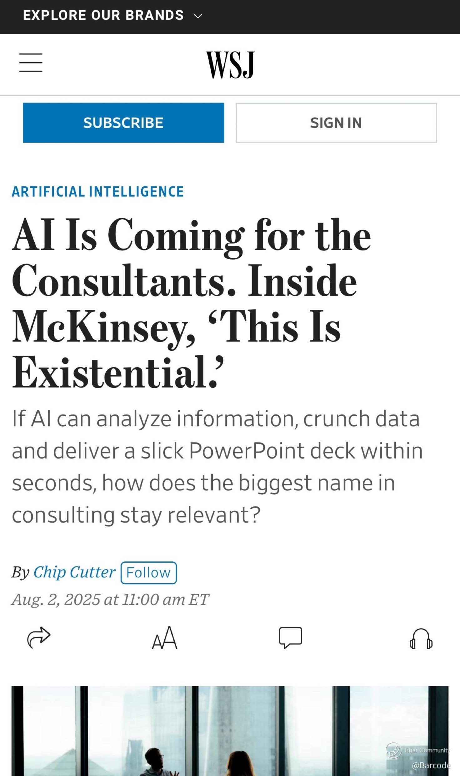 We get existential. One image from a recent Wall Street Journal piece captures this perfectly. It highlights how AIβs growing ability to synthesize data and generate polished strategy decks is shaking elite consulting firms like McKinsey. If a machine can deliver the insights, the deck, and the analysis in under 60 seconds, what exactly is the role of the strategist?