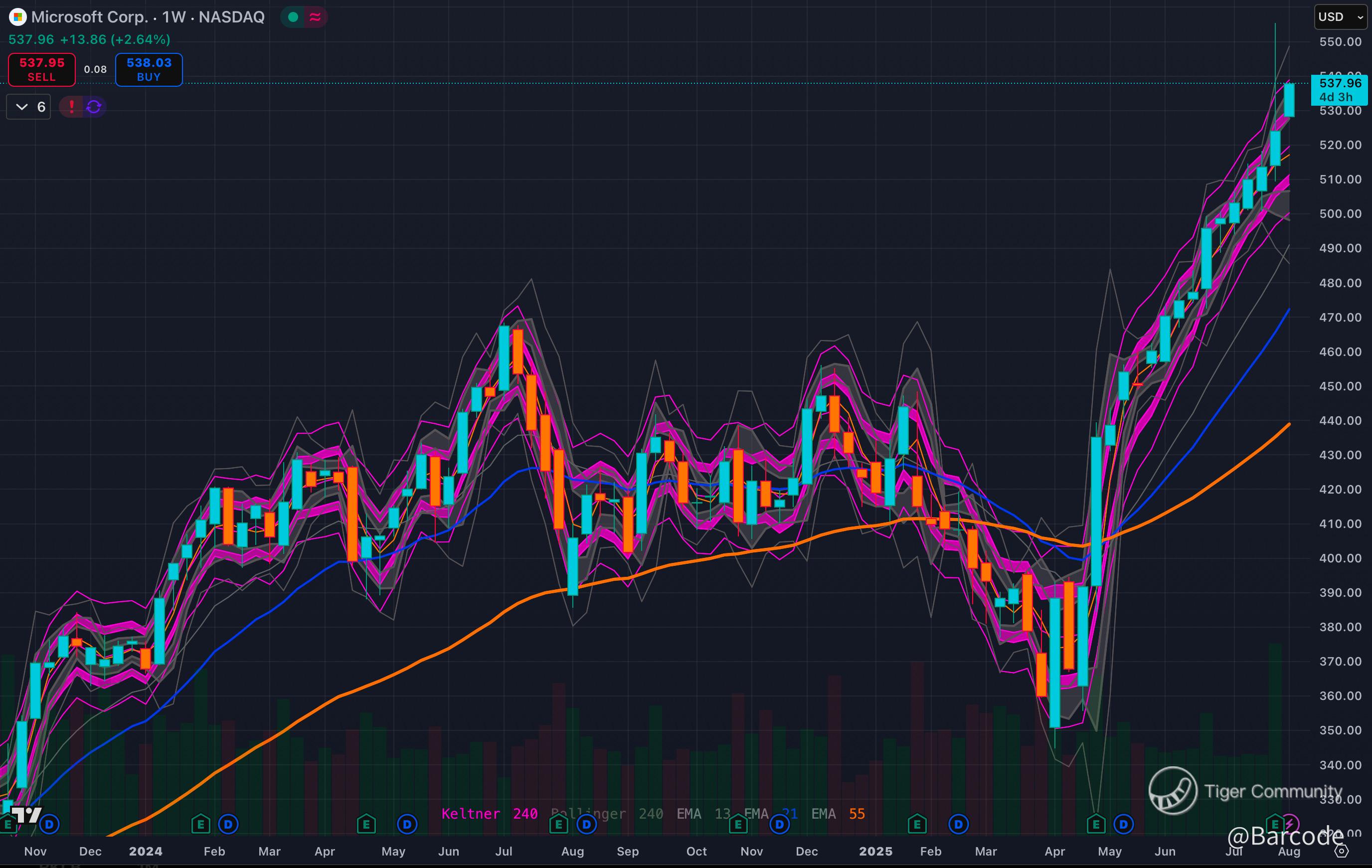 $MSFT posted a weekly candle breakout that shattered its 2024 highs. Price closed at $537.96, with strong follow-through across every Keltner and Bollinger band overlay.