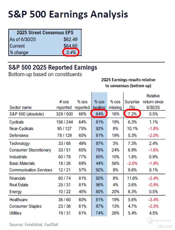 β‘οΈ 84% are beating EPS estimates, with a median surprise of 7.2%