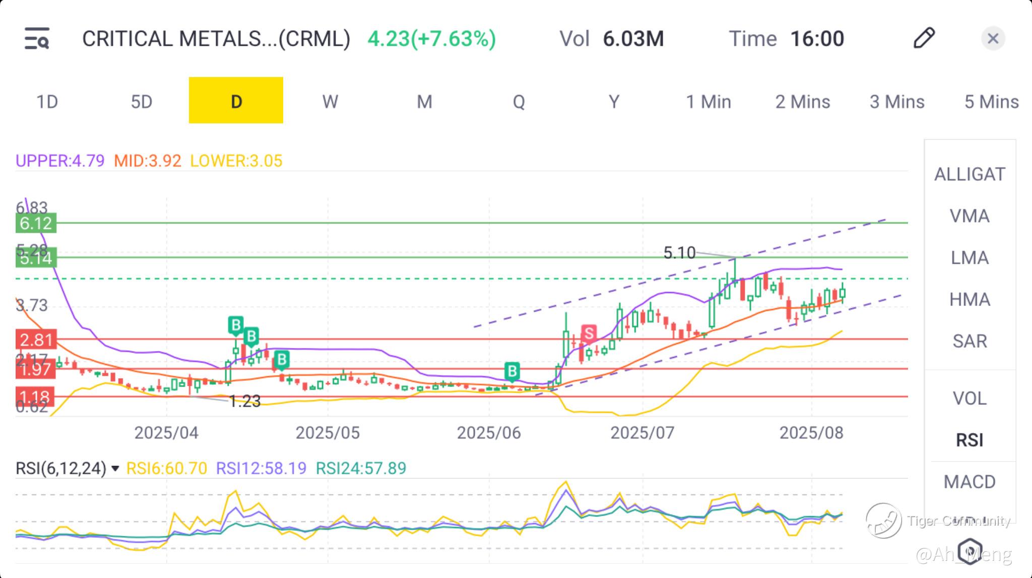 With rare earth minerals holding up and with progress coming from $CRITICAL METALS CORPORATION(CRML)$, the current uptrend would push it back to the last high of around $5.10. The key is if there will be something to push the price beyond that. That would open up $6.37 to be in play! [Chuckle] [Evil]