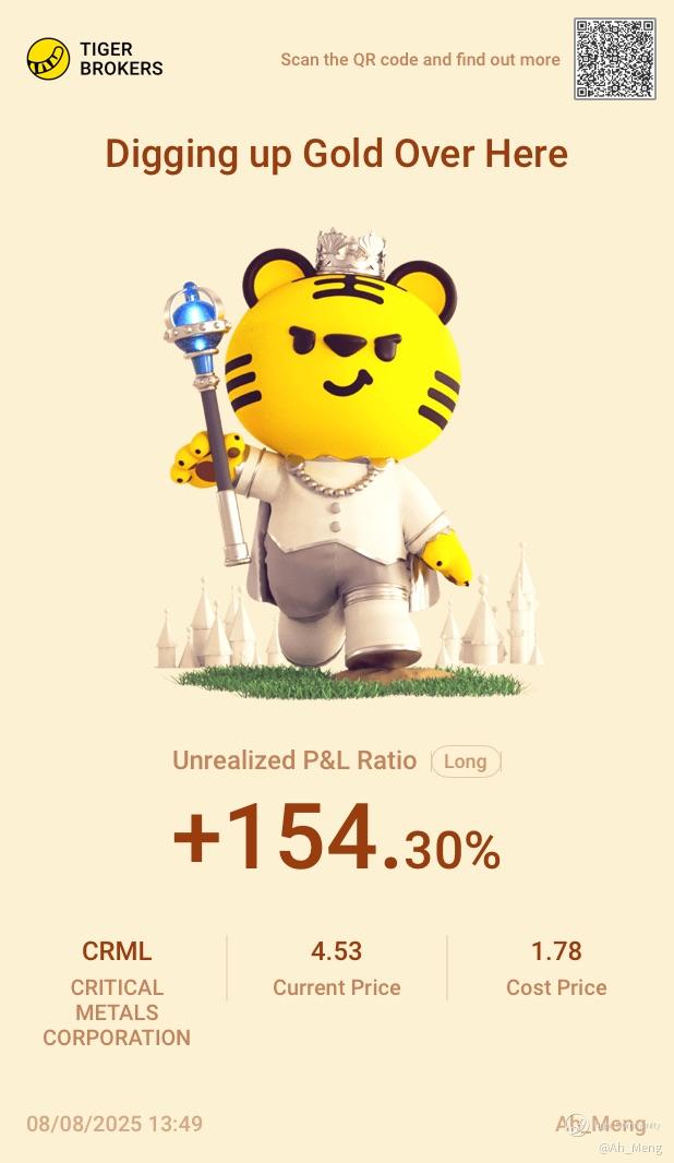 $CRITICAL METALS CORPORATION(CRML)$ I am still waiting... stretching my neck long... for the next US$1000+ absolute profit in 🐯 broker. Rare earth minerals are still very much in the story... with $MP Materials Corp.(MP)$ in the limelight week-in-week-out (for disclosure sake, I am also holding MP), thanks to$Apple(AAPL)$ !