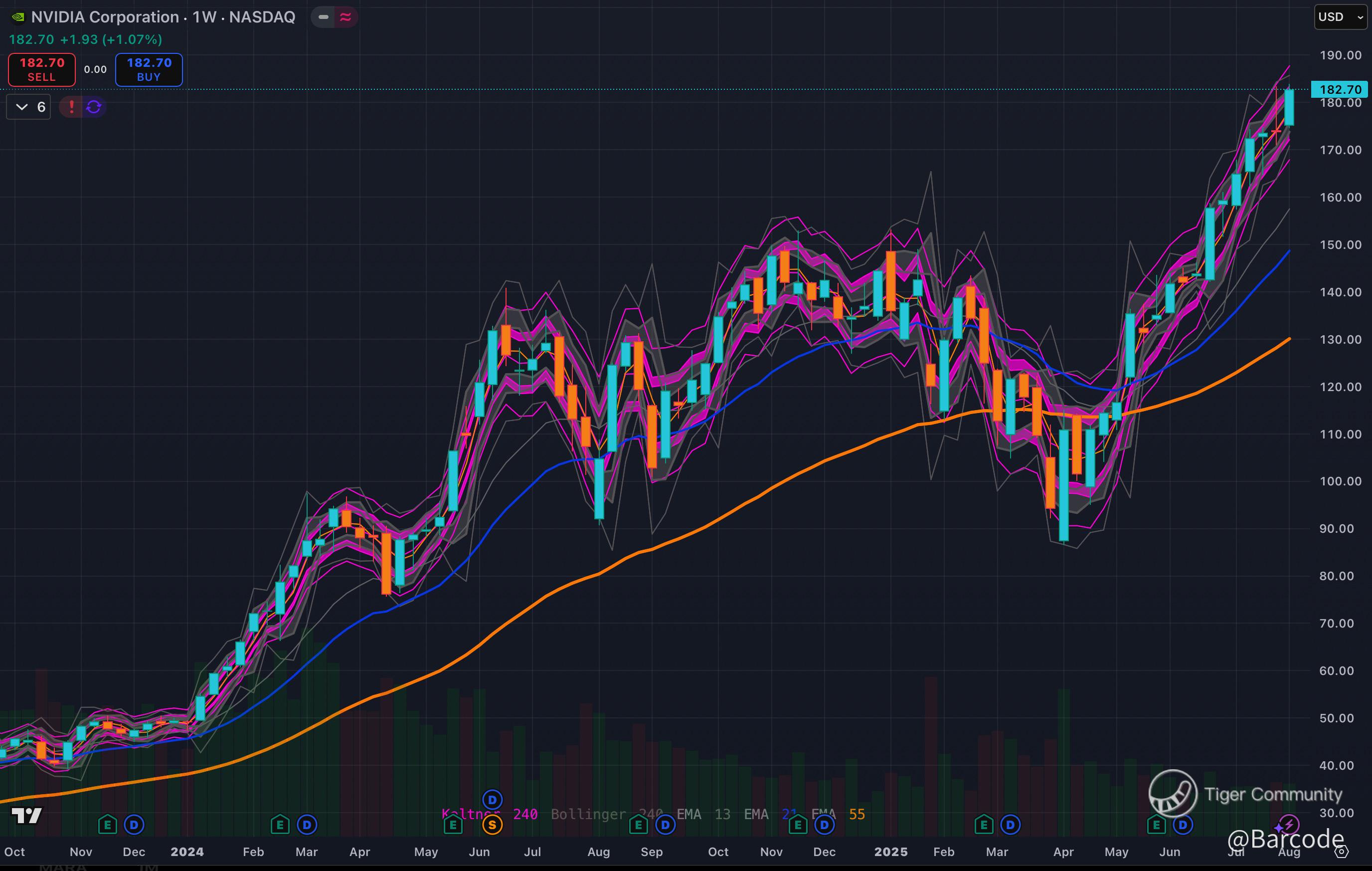Technically, NVDA enters the week in a decisive uptrend. The weekly chart shows price extended well above the 55-week EMA and riding the upper Keltner band, signalling sustained institutional momentum. The 4H chart remains locked in a steep rising channel, hugging upper volatility bands in a controlled climb. Key support sits at $168, with near-term consolidation levels at $173.60 and $181.20. A hold above these levels could see the rally continue if market participants view this as noise rather than a fundamental threat.