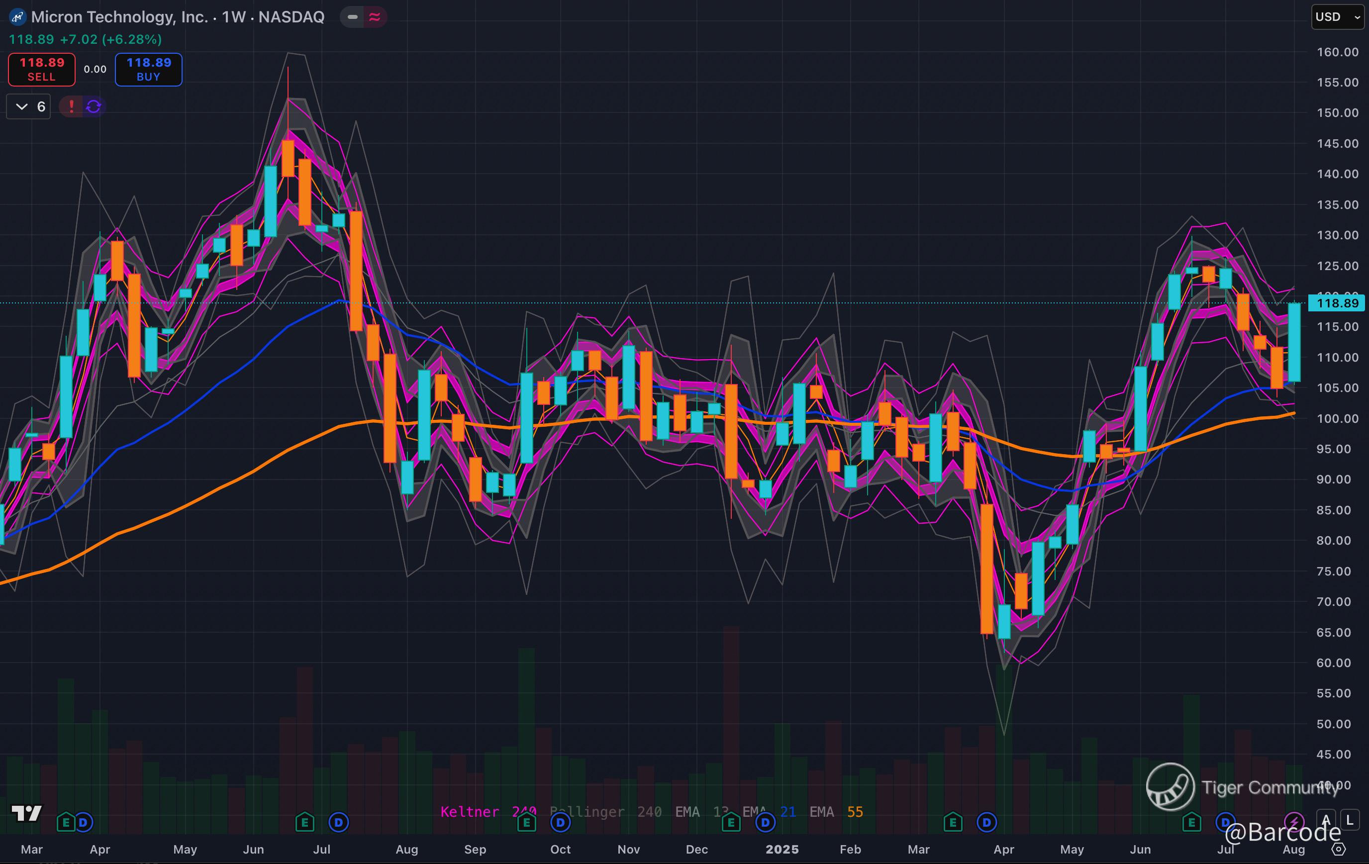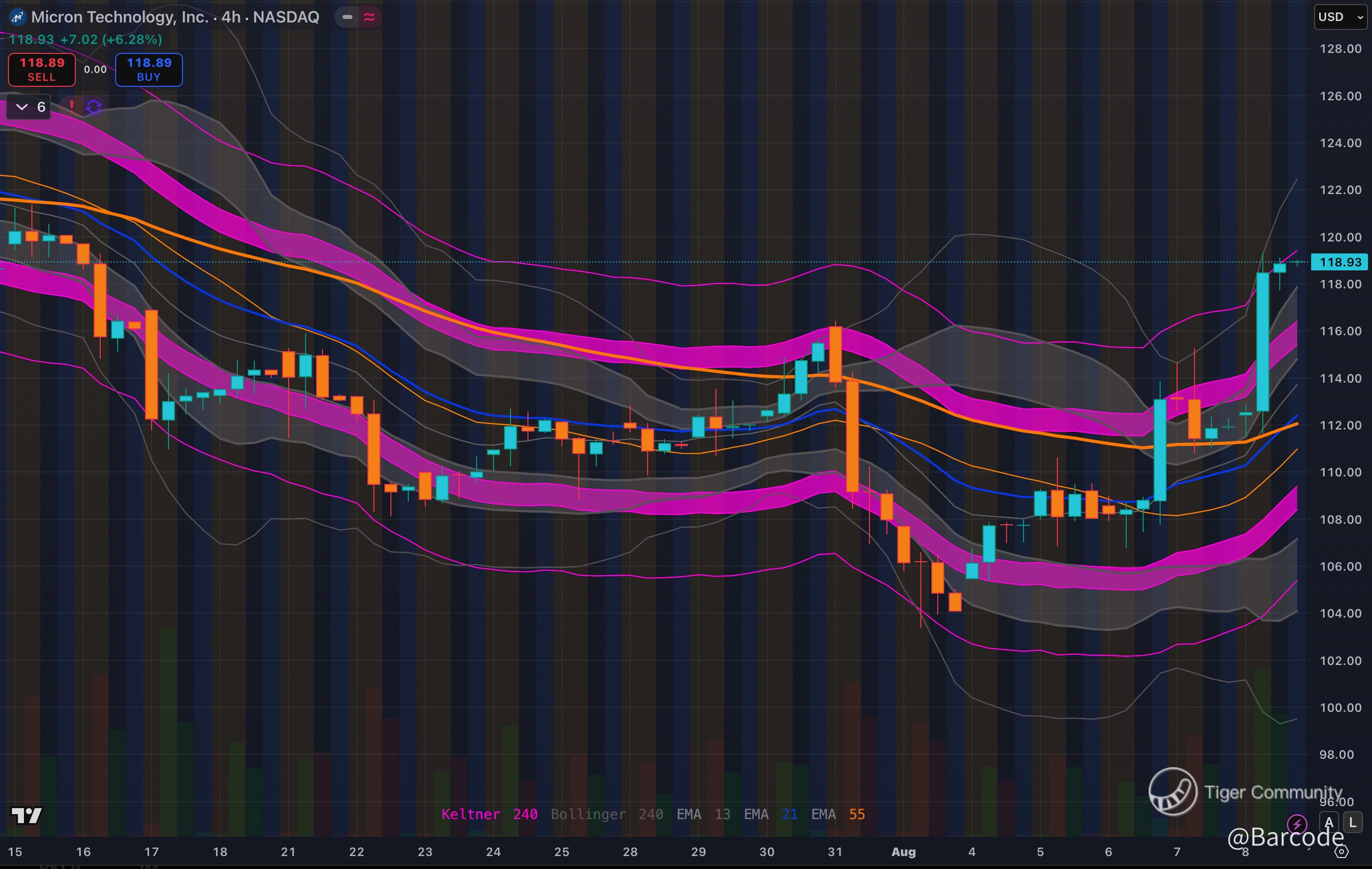 $Micron Technology(MU)$ Iโm zeroed in on $MU as it delivers a textbook weekly bull flag breakout. Price has ripped through the descending channelโs upper boundary and is holding above the $110โ$113 pivot zone, with the all-time high anchored VWAP acting as a perfect pivot. On the weekly chart, resistance sits at $121.30 and $131, with downside support at $113.50, $109.00, and $104.00. The 4H chart shows price exploding above both Keltner and Bollinger bands, with EMA13 at ~$112, EMA21 at ~$113, and EMA55 at ~$115 now stacking as rising support. MACD momentum has flipped firmly bullish. RSI is pushing higher toward overbought but still leaving room for extension. This is the definition of a liquidity flush that transitions into sustained upside.