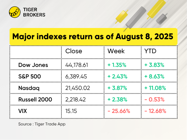 Apple’s surge lifted both the Nasdaq and the S&P 500’s tech sector. Shares of the iPhone maker jumped 13% after the company unveiled a new $100 billion commitment to America, a significant acceleration of its U.S. investment that now totals $600 billion over the next four years. For the week, the S&P 500 gained 2.4%, while the Nasdaq advanced 3.9%.
