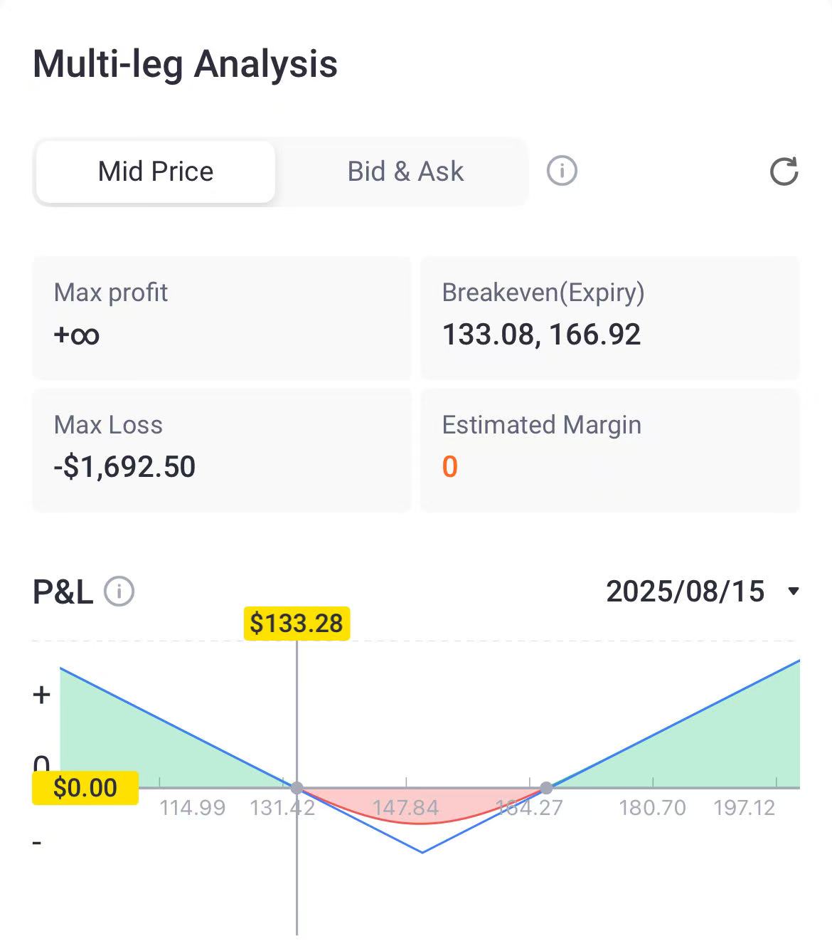 Structure: Buy OTM $160 CALL + OTM $140 PUT