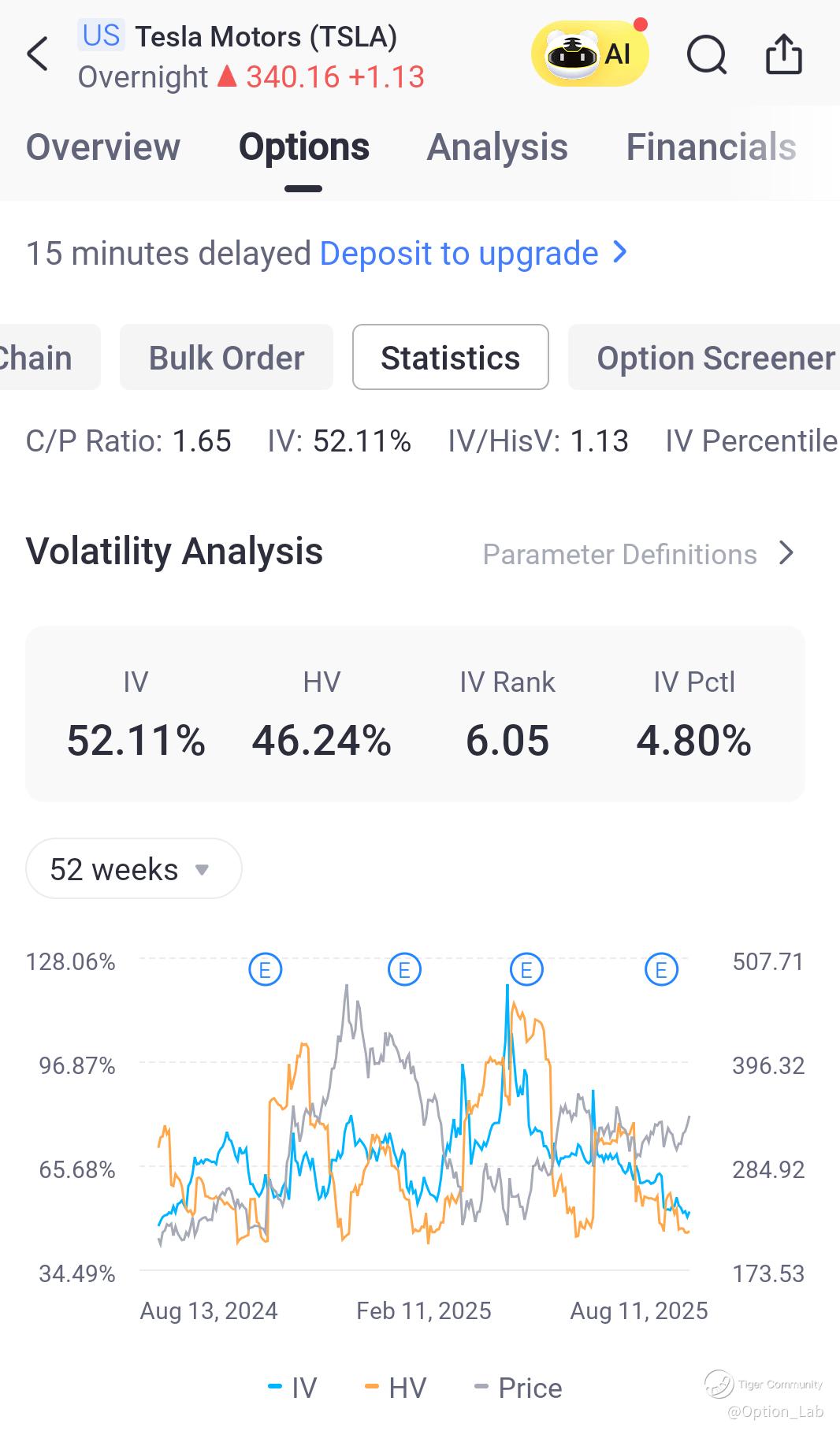 As of August 11 (Mon), $Tesla Motors(TSLA)$ ’s Implied Volatility (IV) stood at 52.11%, while Historical Volatility (HV) was 46.24%.