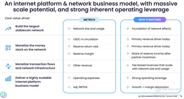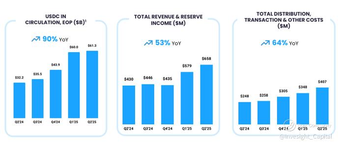 Costs rose in line with growth. Distribution, transaction, and other expenses climbed 64% to $407 million, mainly due to increased USDC holdings and greater balances on strategic partner platforms like Coinbase. Operating expenses hit $577 million, with IPO-triggered stock-based compensation making up the bulk. Operationally, average USDC in circulation rose 86% to $61 billion, market share climbed to 28%, and active wallets grew 68% to 5.7 million—clear signs of USDC’s accelerating adoption in global payments and settlement. This growth also sets the stage for Circle’s future payment network and cross-chain initiatives like the Circle Payments Network and Arc blockchain.