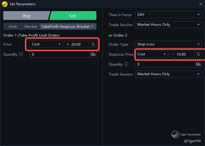 3.Set a bracket order with a 10% stop loss and 20% take profit based on the cost in one click