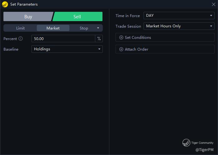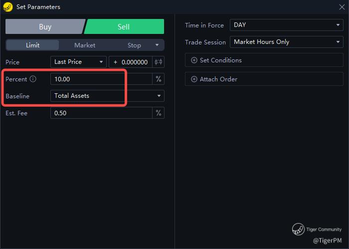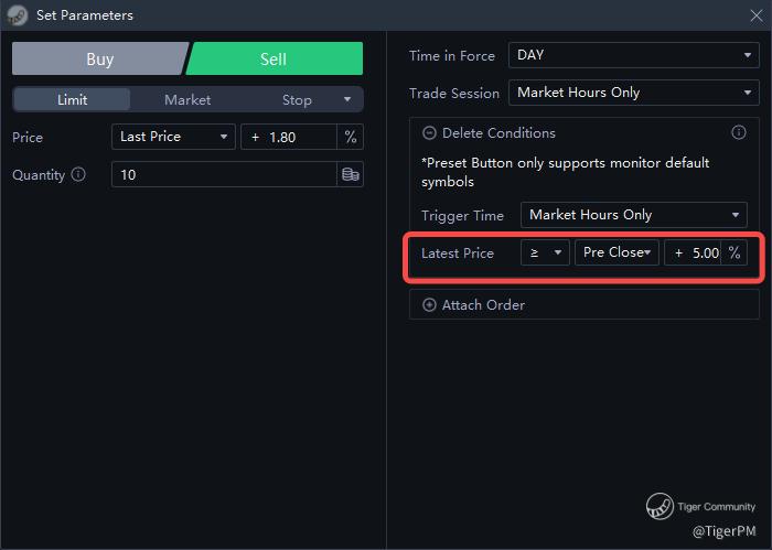 2.Quickly set a price increase conditional order, which triggers a buy when the latest price is 5% greater than the previous closing price.