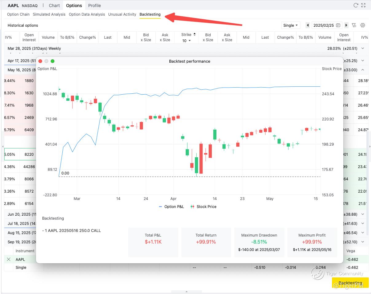 User Guide: It can backtest the profit and loss situation of trading a certain option or option combination in history, compare it with the stock price at that time in history, and compare the option changes before and after corporate actions. You can also directly view the historical option chain data via the feature.
