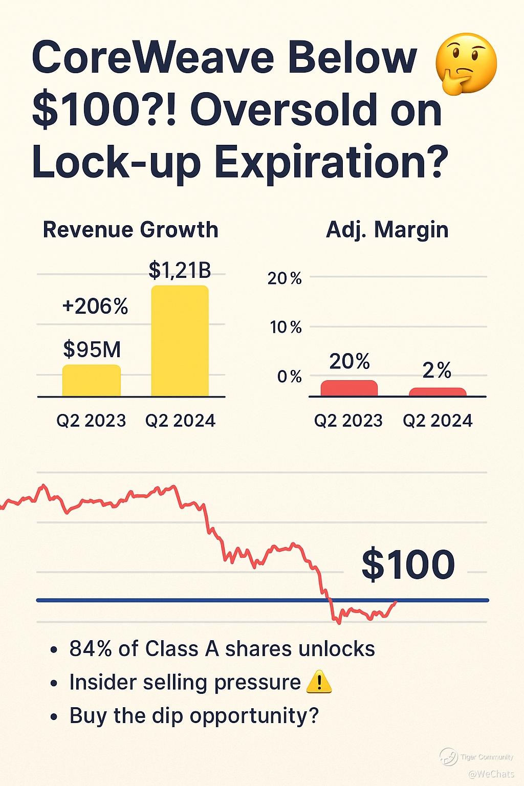 CoreWeave just hit a major milestone: its first post-IPO lock-up expiration. Nearly 84% of Class A shares are now free to trade — many of them held by insiders and key backer Nvidia. That sudden flood of supply rattled the stock, which briefly sank below the psychological $100 mark before staging a modest rebound.