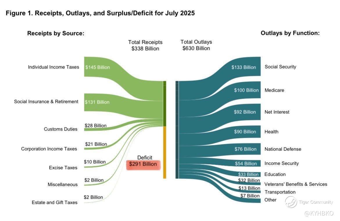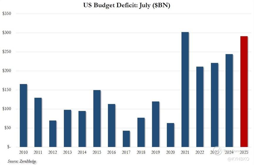 The US Treasury posted a $291 billion budget deficit in July, the 2nd-largest deficit for any July on record. The gap marks a sharp reversal from June’s $27 billion budget surplus. This comes as government spending surged +9.7% YoY to $630 billion, the 2nd-highest since January. Meanwhile, revenue rose just +2.5% YoY to $338 billion, including $29.6 billion in tariff revenue. The deficit is now up +7.4% YoY, to $1.63 trillion FYTD, putting this year on track for the 3rd-largest deficit in history. The deficit spending crisis is worsening.