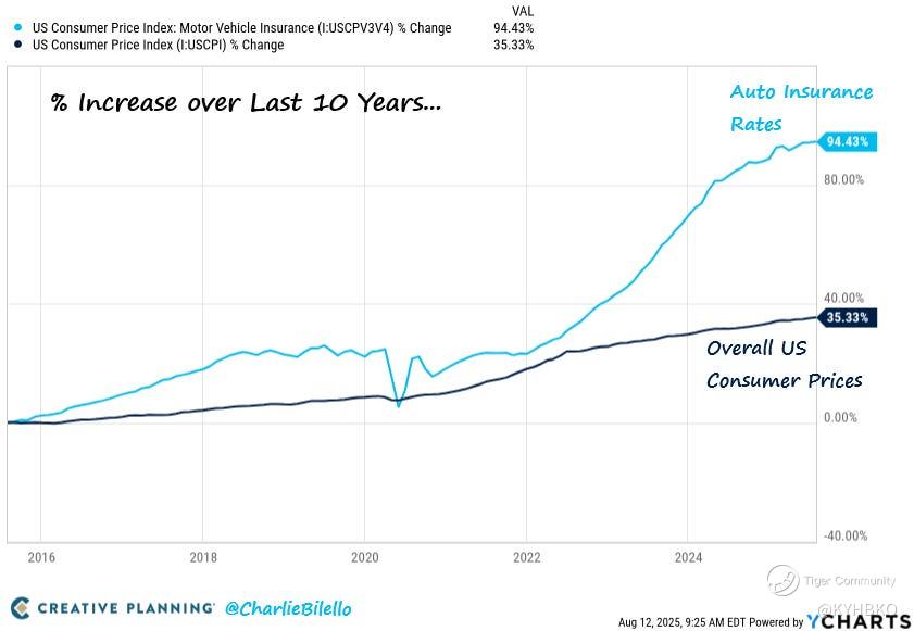 US Auto Insurance rates have increased by 94% over the last decade, far above the 35% increase in overall consumer prices. - Charlie Bilello