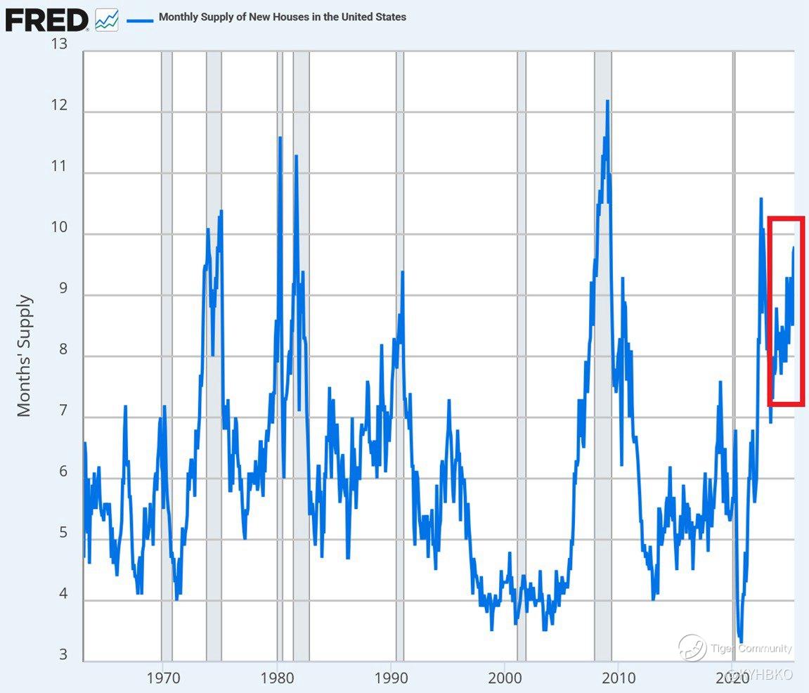 The monthly supply of new homes in the US surged to 9.8 months in June, the third-highest since 2008. This indicator measures how many months it would take to sell current builder inventory at the current sales pace. By comparison, the long-term median is 5.8 months. Since the 1960s, 5 of the 6 times builder supply reached this level, a recession followed. The only exception was 2022, when the economy narrowly avoided a recession. Homebuilders are struggling to sell inventory. - X user The Kobeissi Letter