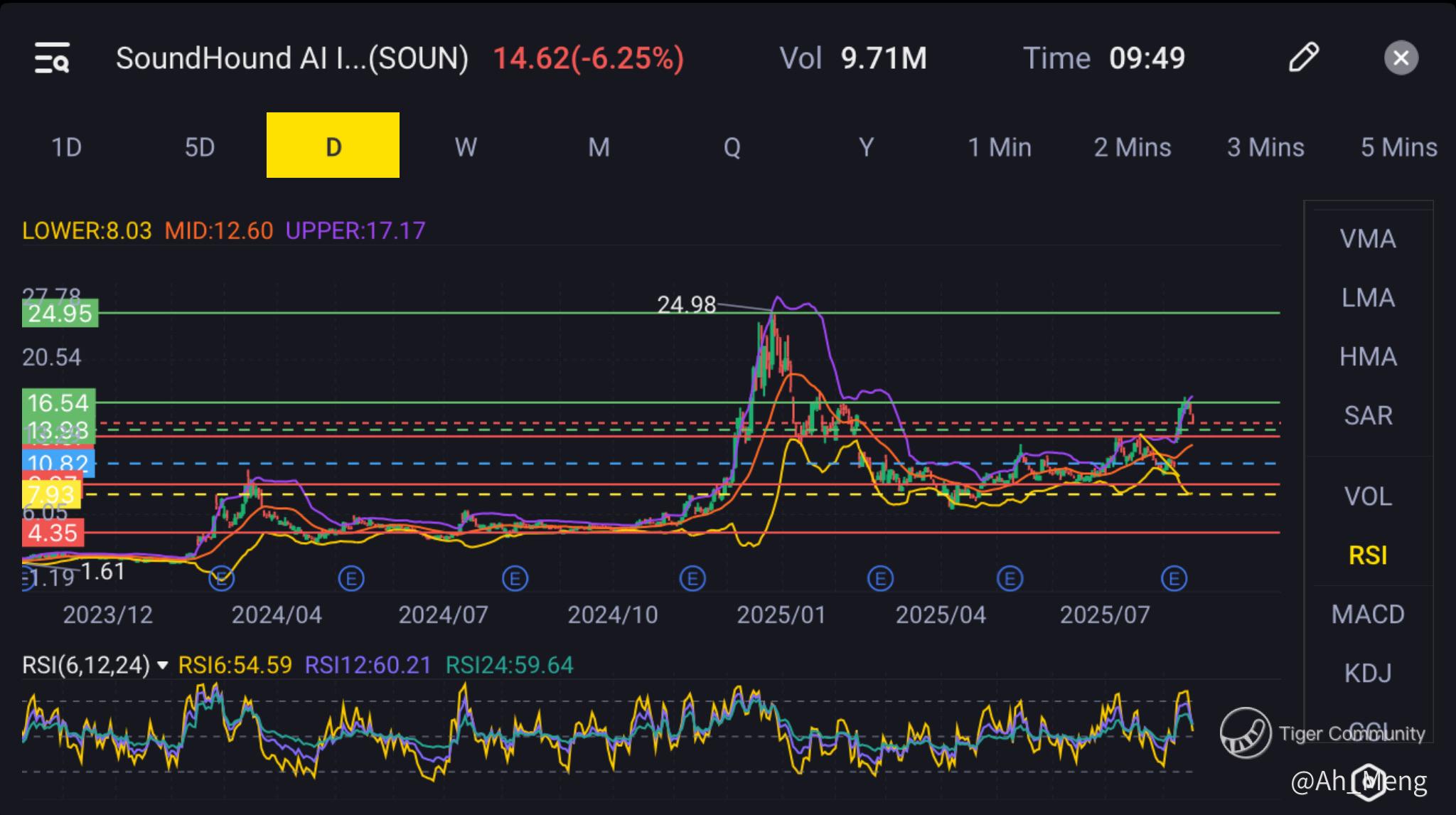 $SOUN 20250919 15.0 PUT$ Overbought? Maybe...$SoundHound AI Inc(SOUN)$ has been on the tear since its latest result announcement, which handily beat expectations. Obviously, looking at the price reaction, Soundhound moves from $9 to $16 within a week...