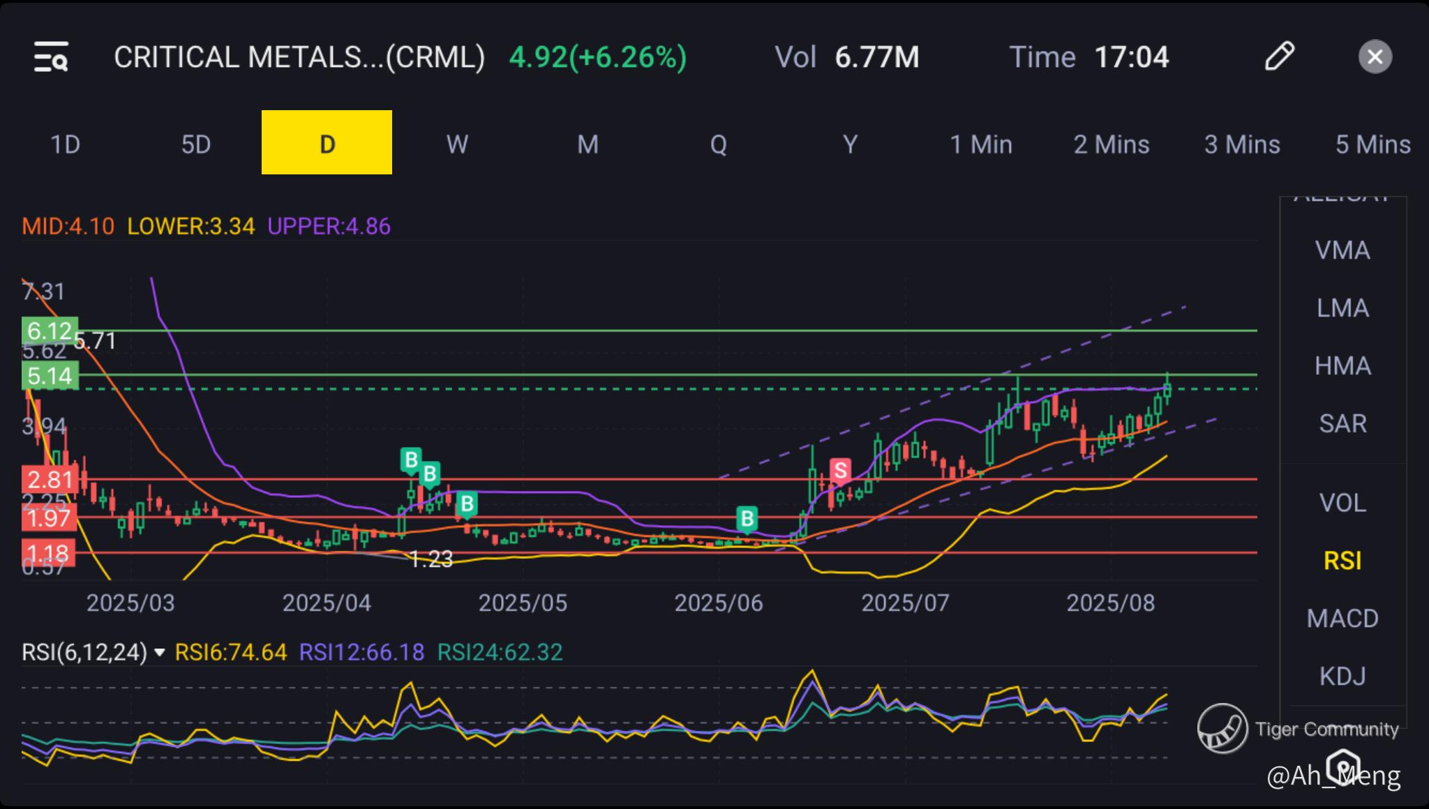 $CRITICAL METALS CORPORATION(CRML)$ Not covering myself with too much glory. I am sharing an old chart to show how far $CRITICAL METALS CORPORATION(CRML)$ has come... it's a good way so far for rare earth minerals. More momentum needs to be generated for this ship đ˘ to hold... now that it has tasted $6-ish, consolidation appears to be taking place. It is sinply a case of too fast too soon... with proper consolidation to build enough energy would it be able to power on... the key to watch now is volume... i.e. participation rate... if volume is low during consolidation is accompanied by volume increment during the up phases, the sign is good. Now we wait... CRML appears very much speculative at the moment. I will allow for "charging" time to take place... if it manages to clear its recent high of $6.07, who is to say it won't go on to its next longer term resistance at $9.27?