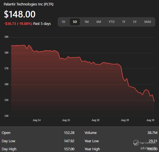 Heavy recent drop: Palantir plunged ~9–9.4% on Tuesday (August 19), marking its worst daily drop in the S&P 500 and extending to a five-day losing streak, amounting to a 12–15% pullback from its August 12 all-time high of $190.