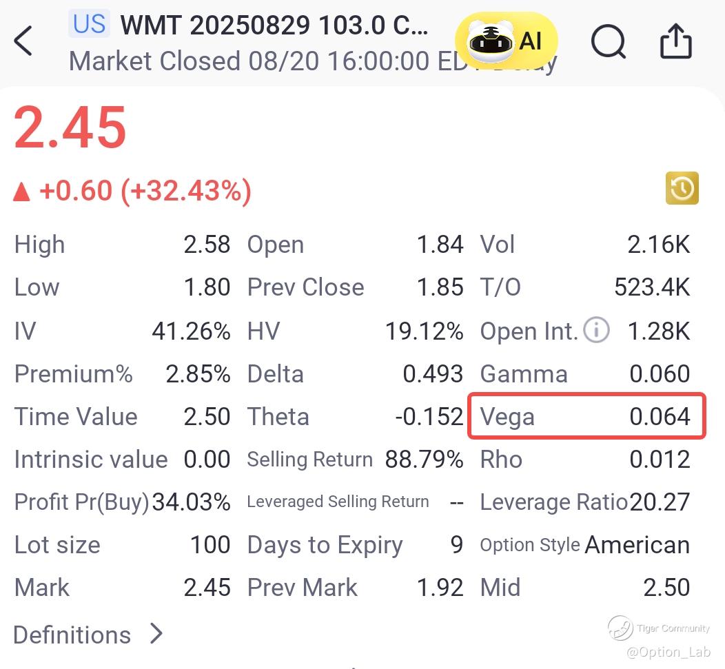 Example: If a $Wal-Mart(WMT)$ option has Vega of 0.064, then a 1% change in IV moves the option price by about 0.064.