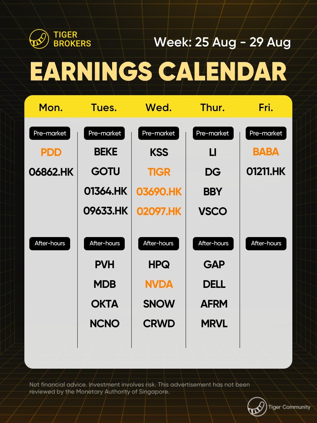 2.Next week, companies including $NVIDIA(NVDA)$ $MEITUAN-W(03690)$ $MIXUE GROUP(02097)$ $Tiger Brokers(TIGR)$ $BABA-W(09988)$ $BYD COMPANY(01211)$ will announce their earnings reports.