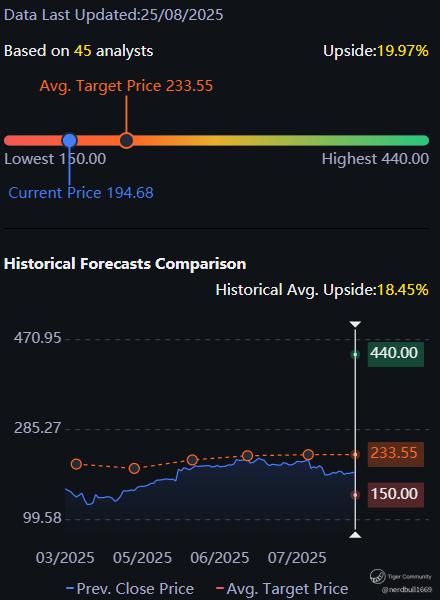 Based on 45 analysts from Tiger Brokers offering 12 month price targets for Snowflake in the last 3 months. The average price target is $233.55 with a high forecast of $440.00 and a low forecast of $150.00. The average price target represents a 19.97% change from the last price of $194.68.