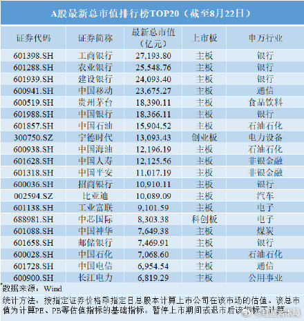 這些市值巨頭包括「中農工建」四大行, $中國移動(600941)$ 、 $中國石油(601857)$ 等「中字頭」企業,以及 $貴州茅臺(600519)$ 、 $寧德時代(300750)$ 等行業龍頭。