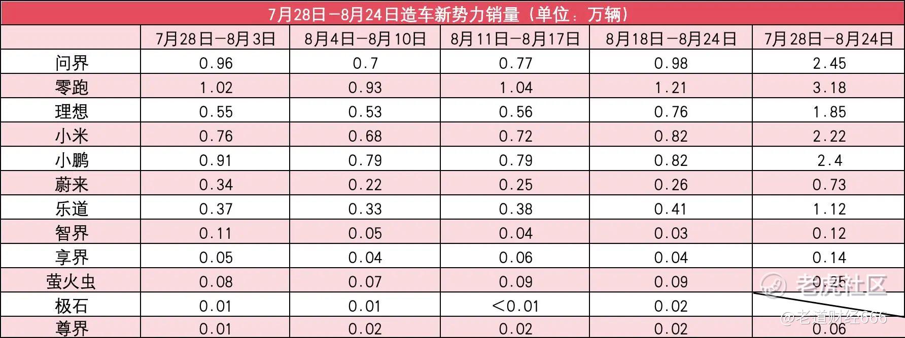 臨近月底,各家周銷量又開始衝刺模式。在剛剛過去的一週(8月18日-8月24日),新勢力整體周銷量以“漲”字爲基調。從銷量和排名來看,零跑穩居第一,依然是唯一週銷量過萬的新勢力;而問界也快速追趕,已經反超小鵬重新躋身第二,距離過萬也只差一步之遙;小米和小鵬上週銷量規模相當,分別位列第三、四位;理想銷量開始回升,但仍然排在第五位;樂道雖然依舊在第六位,但周銷量規模已經增長到了4000輛+的水平。