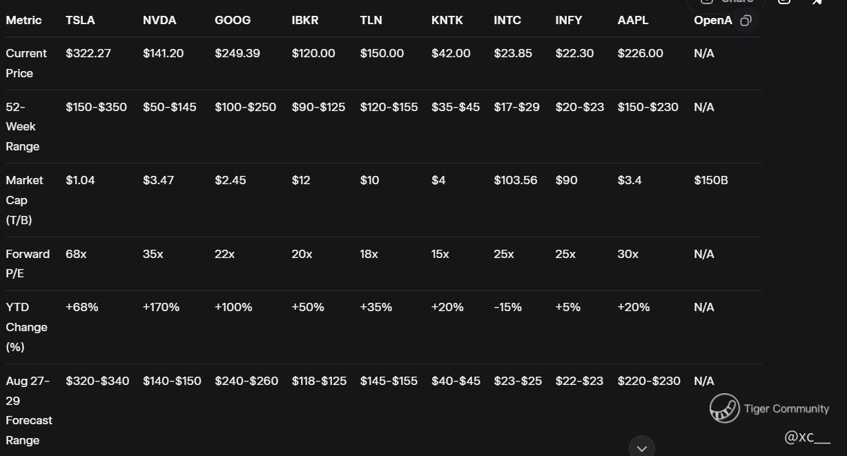 Tesla ( $Tesla Motors(TSLA)$ ): At $322.27, up 2%, Musk's lawsuit against Apple/OpenAI could boost sentiment; support at $320, resistance at $330—a possible 3-5% gain if EV demand holds.