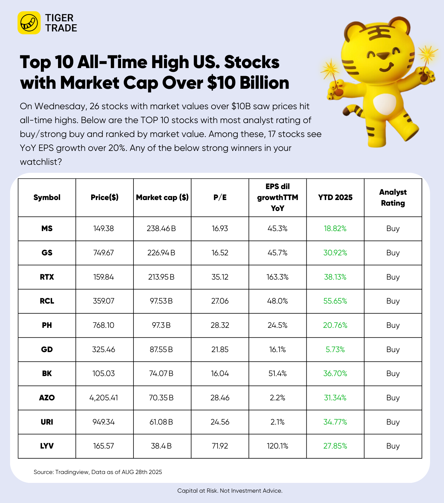 According to TradingView, on Tuesday, there were 16 stocks with market value over $10B that saw prices hit all time high. Below are the TOP 10 stocks with analyst rating of buy and ranked by market value: $Morgan Stanley(MS)$ $Goldman Sachs(GS)$ $RTX Corp(RTX)$ $Royal Caribbean Cruises(RCL)$ $Parker Hannifin(PH)$ $General Dynamics Corp(GD)$ $Bank of New York Mellon(BK)$ $AutoZone(AZO)$ $United Rentals(URI)$ $Live Nation Entertainment(LYV)$