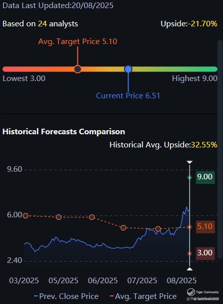 Current price: $6.51 (implies –21.7% downside to avg PT).